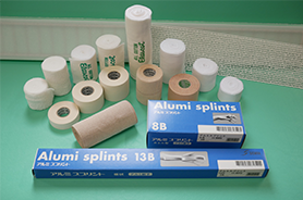 軽い捻挫、筋、関節の痛みに対し、数種類のテープを症状や各スポーツ種目、生活スタイルに合わせて施します。 巻き方の指導も致します。 骨折、脱臼、ひどい捻挫など症状により副子、包帯で固定を施します。